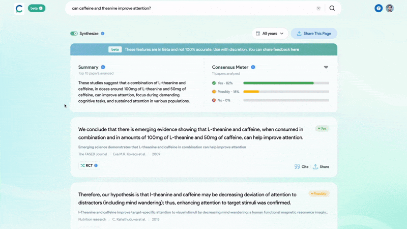 Step 1 Run a search in Consensus example: can caffeine and theanine improve attention? Step 2